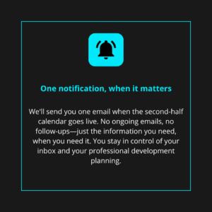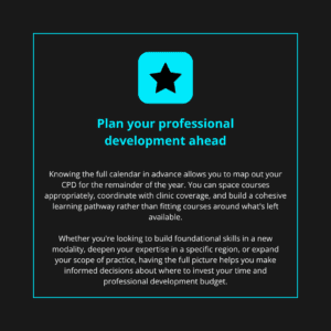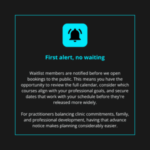By joining the waitlist, you’ll be among the first to know when the full calendar is released, giving you the chance to map out your CPD, secure dates that work with your schedule, and invest in the areas of learning you’ve been wanting to pursue.